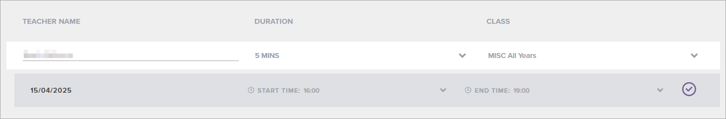 - Change the Start Time and End Time if the particular teacher is not available at the start of the evening or has to leave early.