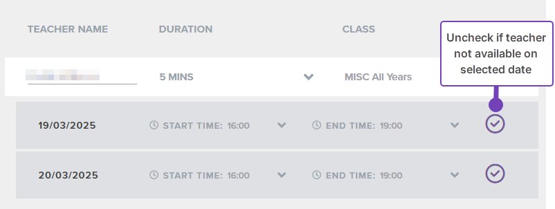 - Where an event runs over multiple days, uncheck any day where the teacher is not available: