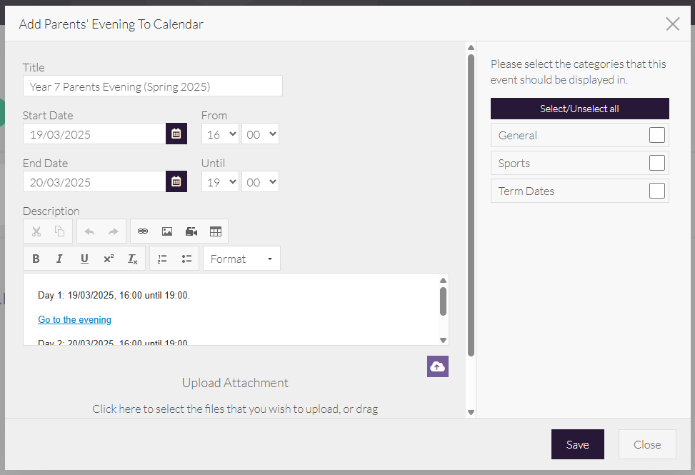 - Enter a Title for the event, for example, Year 7 Parents Evening (Spring 2025).
