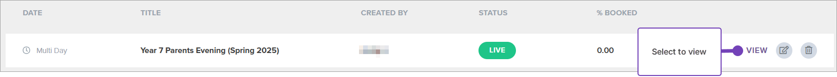 - Select View next to a relevant live parent evening from the Dashboard: