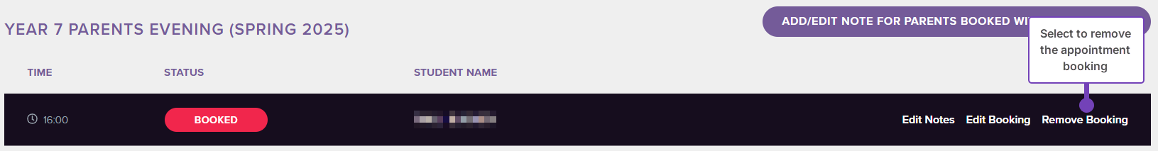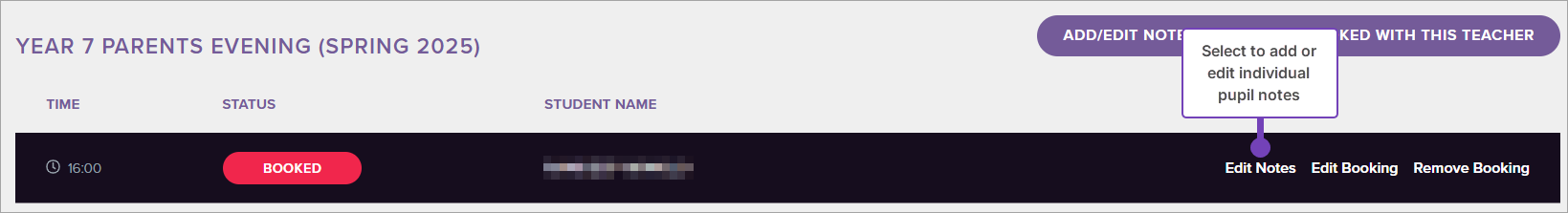 - From the list of available appointments, select Edit Notes to add / edit notes for a specific pupil: