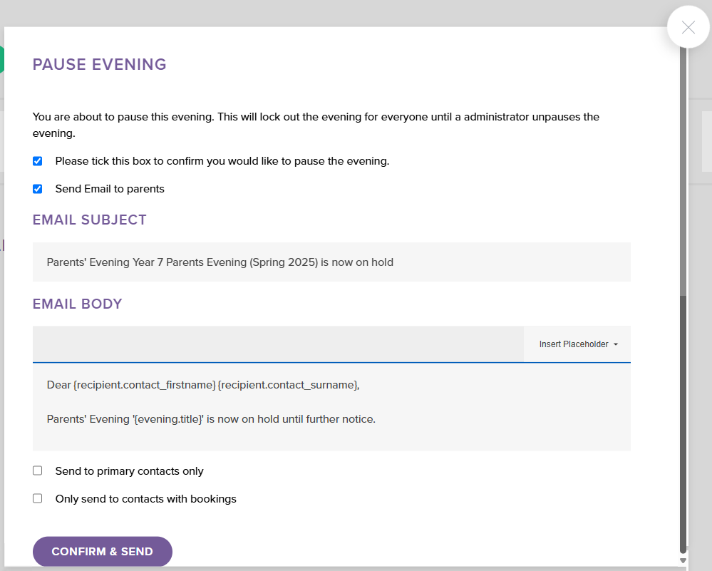 - Optionally, when prompted, check Send Email to parents if you want to let them know you have paused bookings and when you will reopen them: