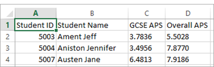 The separate spreadsheet file that you have created is ready to be imported into Sisra Analytics. The APS values are in separate columns, meaning you can select the Broadsheet import type. For further information about how to import see Sisra Analytics: KS5 - How do I prepare and import Core Baselines? (Admin).