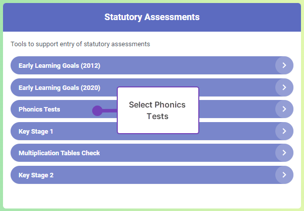 2. From the Statutory Assessments pane, select Phonics Tests: