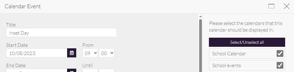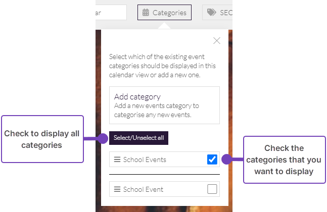 - Check the categories that you want to display in the calendar: