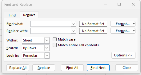 - Use Find & Replace to replace the commas with a blank, or a semicolon: