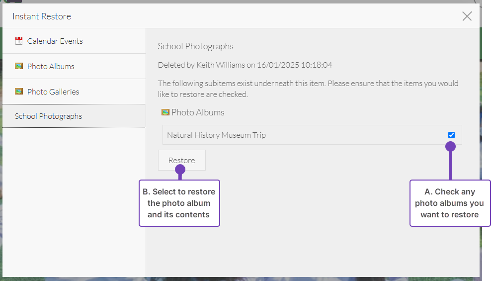 - When prompted, check any photo albums you want to restore that are held within the photo gallery, then select Restore to recover the photo gallery and checked albums to their original location: