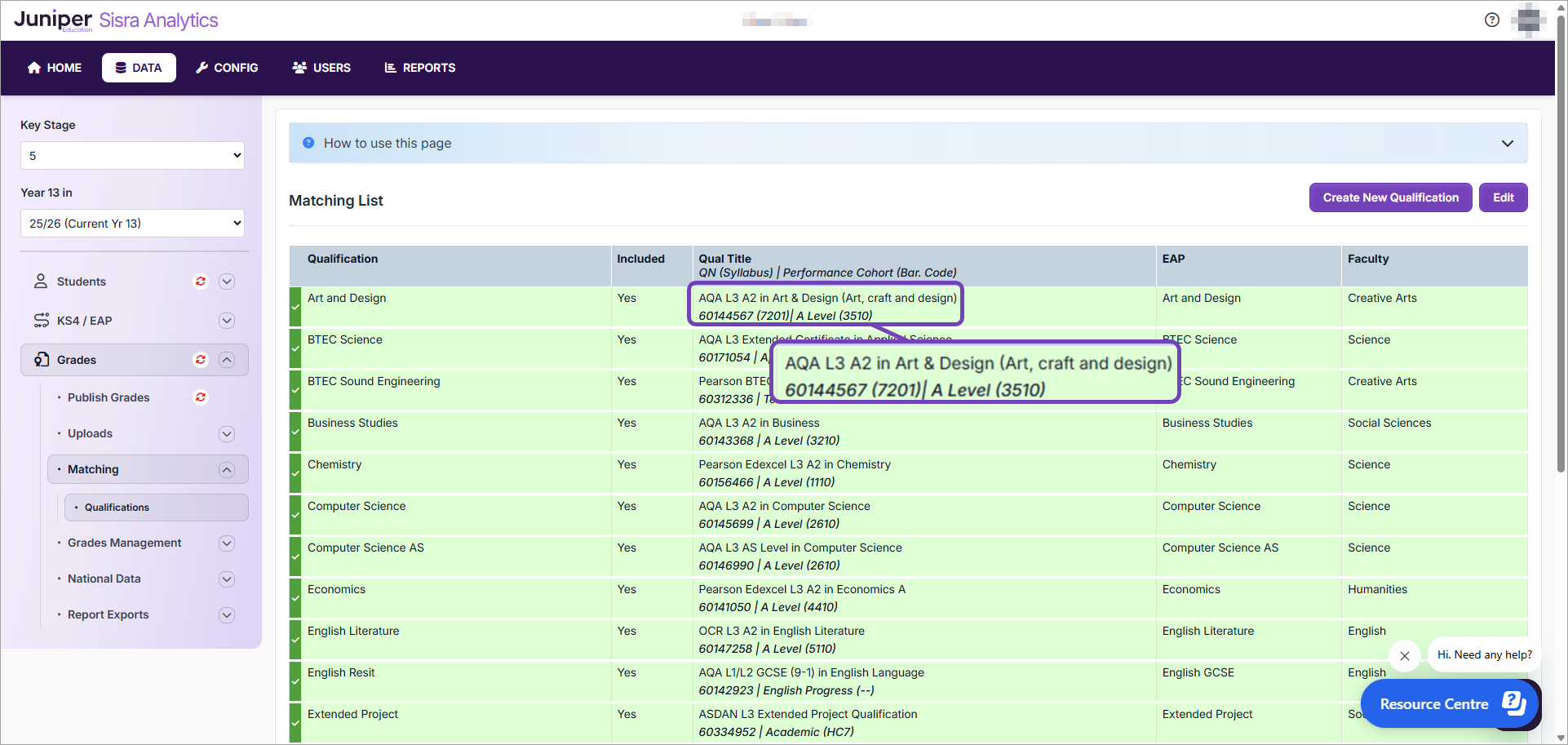 This page is completed by entering the QN codes for the qualifications your students take and matching them to the official DfE qualification (see Sisra Analytics: KS5 - How do I complete the Matching Page? (Admin).