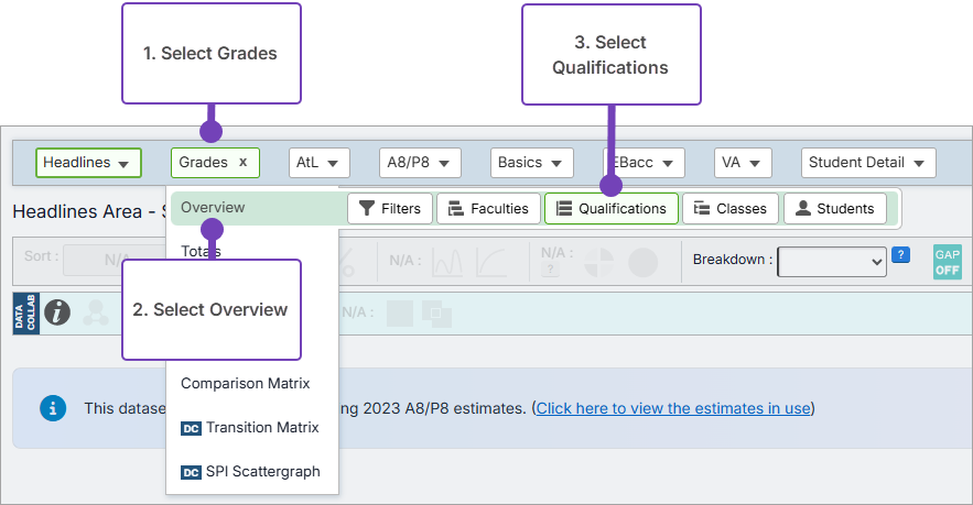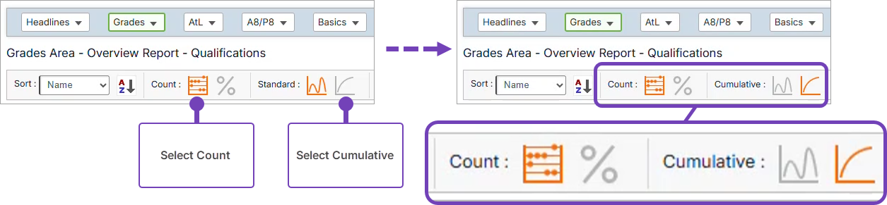 This article explains how to view grade ranges for internal analysis, for example, the number or percentage of 9-7 and 9-5 grades for each qualification. You can also view cumulative grade ranges. This is done through the Grades area of KS3/4 reports.
