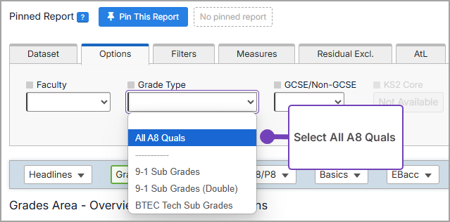 - From the Options tab, select All A8 Quals as the Grade Type: