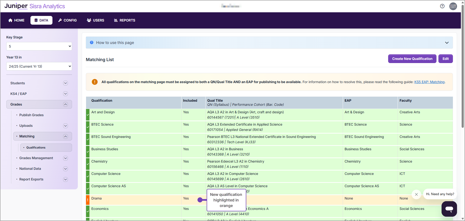 - Complete the Matching process for this qualification (See Sisra Analytics: KS5 - Completing the Matching page (Admin)).