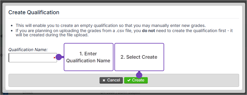 - Enter the Qualification Name. Use a generic/clear name, for example, Drama and BTEC Hospitality, as the qualification name will be used on all reports.