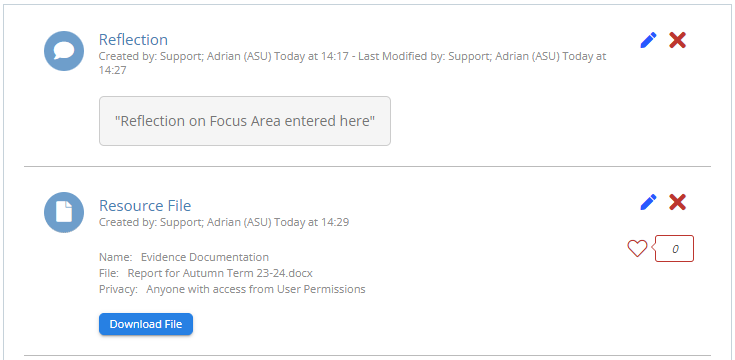 To view the associated reflections, resources or actions, click into the record name. Under each Focus Area, there is a count of each item shown, so you can use this to see where the information is shown.