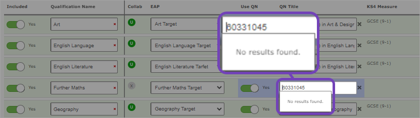This article explains you set up your Level 2 Further Maths (GCSE) qualification. The qualification has never been approved to count in performance tables (it is not on the DfE's Approved Qualifications list), therefore, when you attempt to match it in Sisra Analytics by entering its QN, no qualification appears: