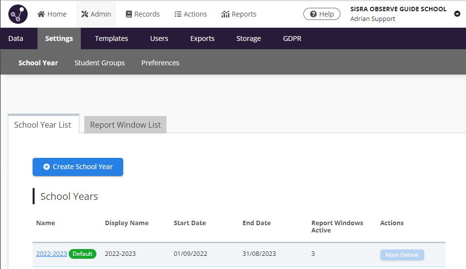 The example screenshot above shows that the 2022-2023 School Year is currently set as the 'Default' year. This means that when you click into either Records, or Reports, the records showing by default will be those within the Start and End dates of that year (in this case, those between 01/09/2022 and 31/08/2023).