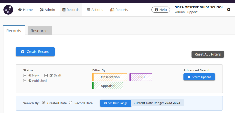 Once a School Year is set as the Default, navigating to Records or Reports will now immediately show all records related to that year.