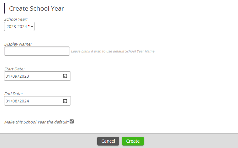 At the start of each year, we would recommend creating the new School Year by navigating to the Admin > Settings > School Year area mentioned above, and clicking 'Create School Year'. From here, once the relevant year is selected, you would then need to specify the desired Start Date and End Date of that year.