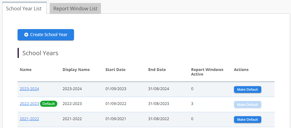 The Default Year can be amended at any time by clicking Make Default under the Actions column of the School Year List tab. The Start and End dates of each year can also be amended if needed by clicking on the year in question.