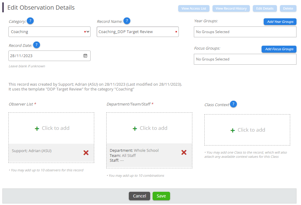 To edit an observer/owner, department, team, staff or class, click ‘Click to add’. To remove existing selections, click the red X. Then, click ‘Save’.