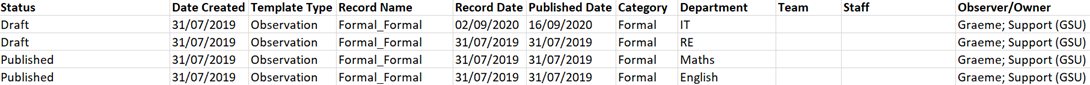 The Full Record List export will export a list of all records, including information such as status, record name, date, faculty, subject, staff and observer, as well as any year groups or focus groups selected: