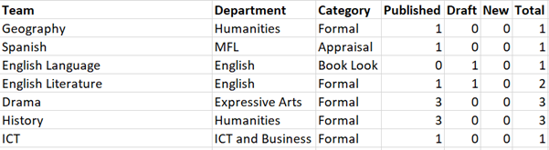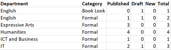 The Department export will display the counts of either published, draft or new records created against each department, e.g. English, Expressive Arts, etc. alongside the selected category:
