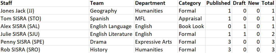 The Staff export will display the counts of either published, draft or new records created against each member of staff, alongside the selected category and associated department and team. This may display multiple rows per staff member if they are in more than one team: