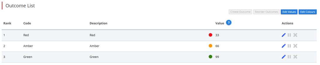 Then, find the total of these figures (Total Outcomes x Value column) and divide this by the record count. In this case, this would be 561 / 8 = 70.125. This average would then be rounded down to the nearest value for that outcome set, which would be Amber (66).