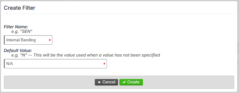 Enter a clear filter name (e.g. “Internal Banding”) and an appropriate default value (e.g. “N/A”), which will be allocated when a student is imported with a blank value for this filter.