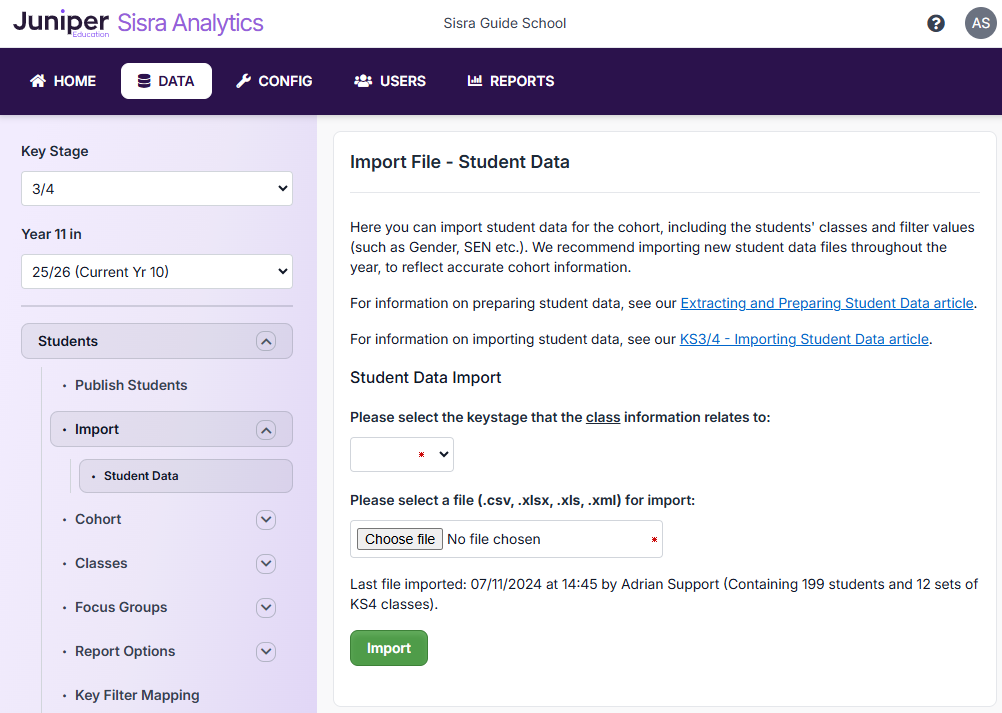 Select the key stage the student data relates to in the dropdown, select the file for import, and then click ‘Import’. Once the file has been imported and the STUDENTS data has been republished for the appropriate cohorts, this filter should pull through to the reports.