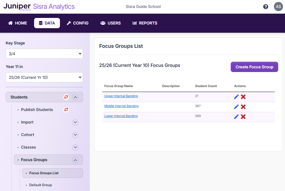 To create separate Low, Middle, and High focus groups, click DATA > select key stage and cohort > STUDENTS > Focus Groups. Click on ‘Create Focus Group’, enter a clear focus group name (examples below), then click ‘Create’. Then, place a tick next to each relevant student(s) and click ‘Save’.
