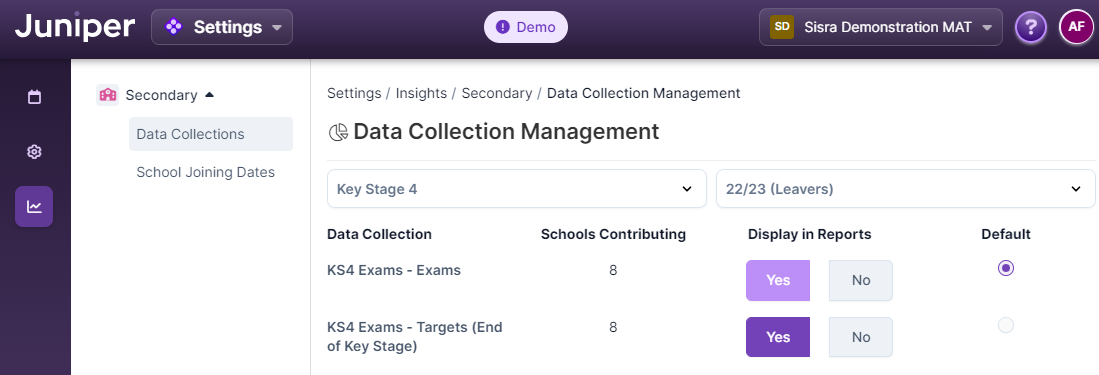 To check which schools have been promoted for each Grade Type, head to the Data Collection Management area within the MAT Dashboard, via the Settings focus area in the dropdown at the top.