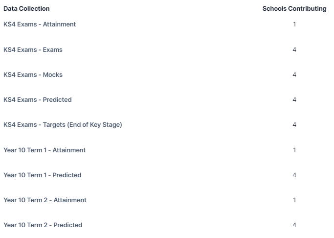 You will also be able to see the number of Schools Contributing within the trust per Data Collection, e.g. in our example there are 4 schools contributing to the KS4 Exams - Mocks collection.
