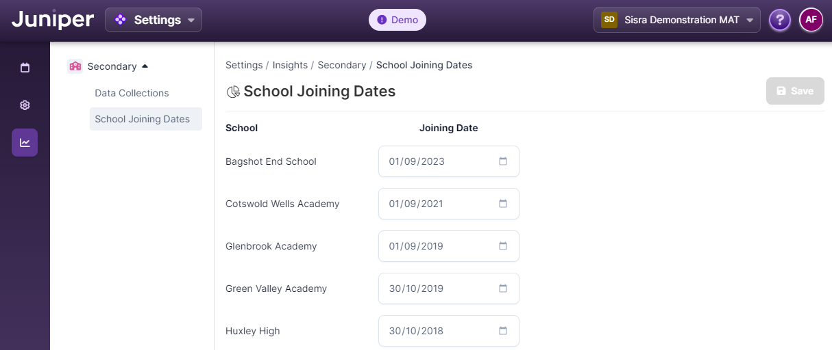 If necessary, you are able to amend the dates in which each school joined your Trust in this section. This is important to ensure KS4 MAT-related figures are calculated correctly when applying DfE weighting.