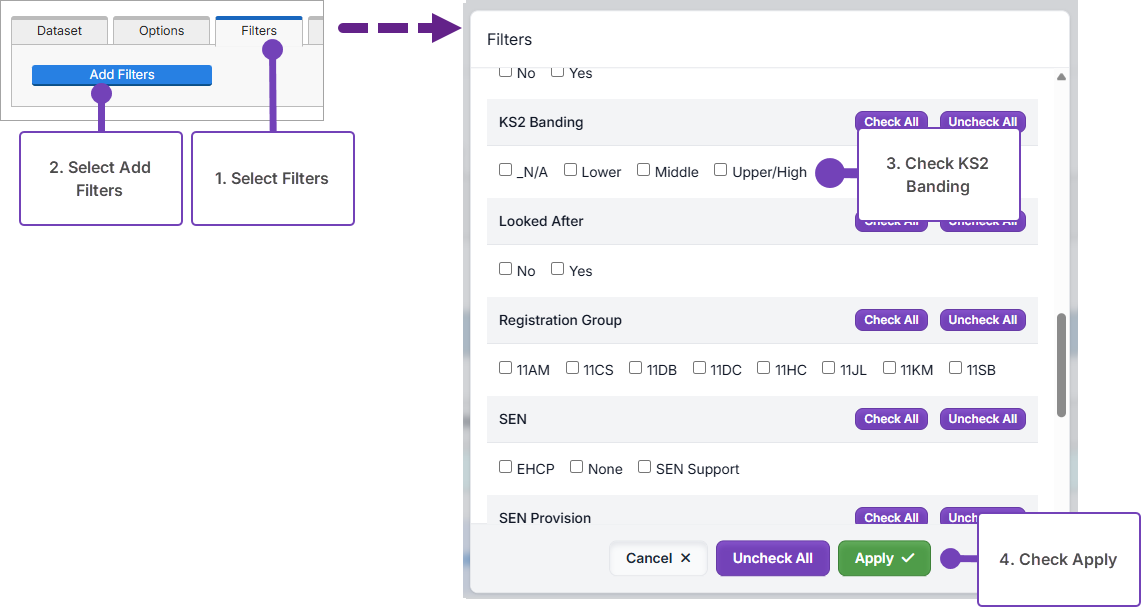 From within a report, select the Filters tab, then select Add Filters, select the KS2 Banding (Lower, Middle, Upper/High) of your choice and select Apply, to include only students within those band(s):