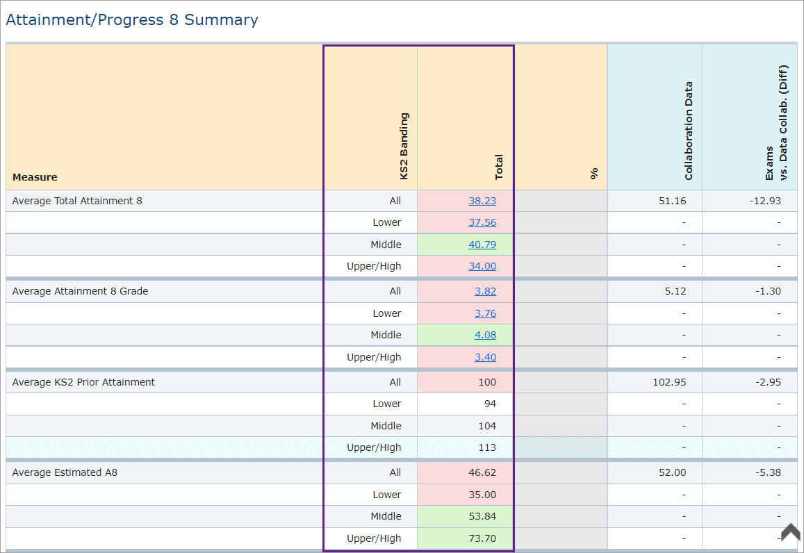 For example, when viewing the Attainment/Progress 8 figures, sorted by KS2 Banding using the Breakdown box, all the figures in the reports are broken down into the three KS2 Bandings (Lower, Middle, Upper/High), allowing you to analyse their performance: