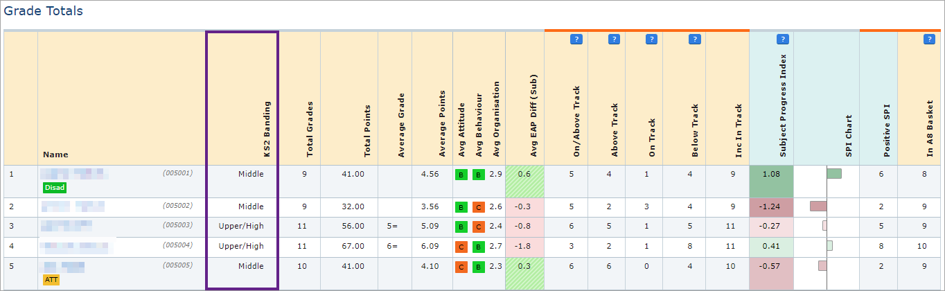 Similarly, when applied at the student level of a report, a sortable KS2 Banding column is added to the report, letting you see each student's band: