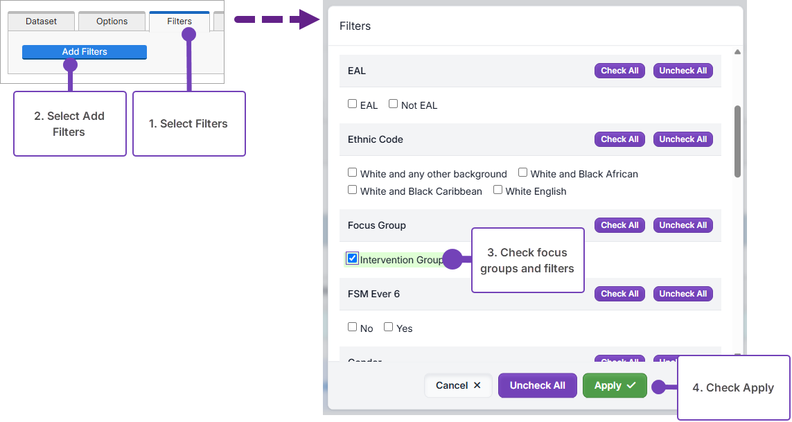 This article explains how to filter your reports using Focus Groups (created by Sisra Administrators at your school) in the KS3/4 reports.