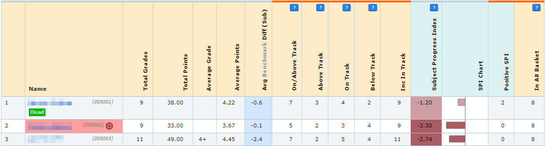 When viewing a list of students in the KS3/4 reports, Sisra Analytics will highlight those included in your default Focus Group (as defined by your Sisra Administrator) with their chosen colour. This makes them easier to spot during analysis: