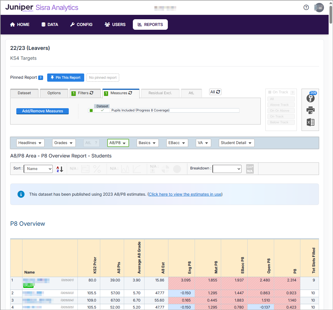 - The A8/P8 Area - P8 Overview - Students report opens. This lists all students in the cohort who have KS2 Prior Attainment data, and are included in the Progress 8 measure: