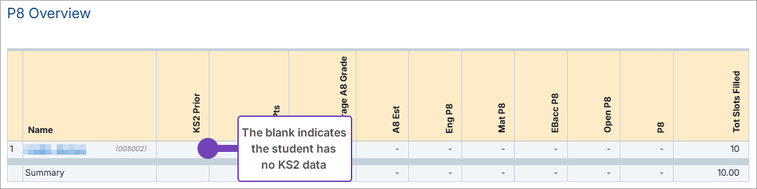 All students On Roll in your cohort with no KS2 data have a blank in the KS2 Prior column. These students do not count in Prior Attainment-based measures, such as Progress 8 or SPI.