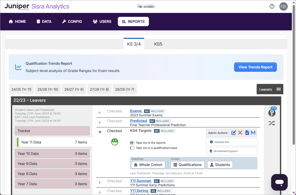- Select Reports > select KS3/4 > Select Cohort and Data Set > Whole Cohort report.