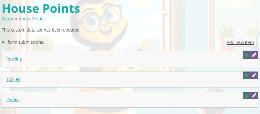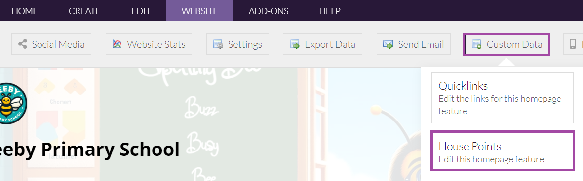 If you have a custom House Point are on your site, you will be usually be able to edit the points, as well as house colours and/or badges, through Custom Data.