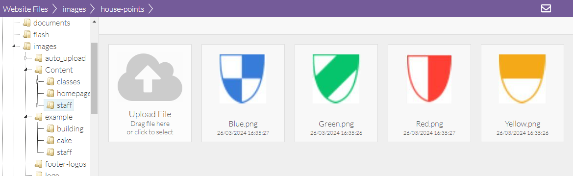 - Click the Upload File option, or drag and drop images from your computer, into an appropriate folder in the File Manager.
