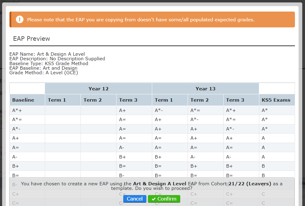 If the EAP you are copying does not have all EAP pathways populated with expected grades, you will be presented with a pop up informing you of this and asking if that is definitely the EAP that you want to copy. To proceed, you will just need to click 'Confirm'.