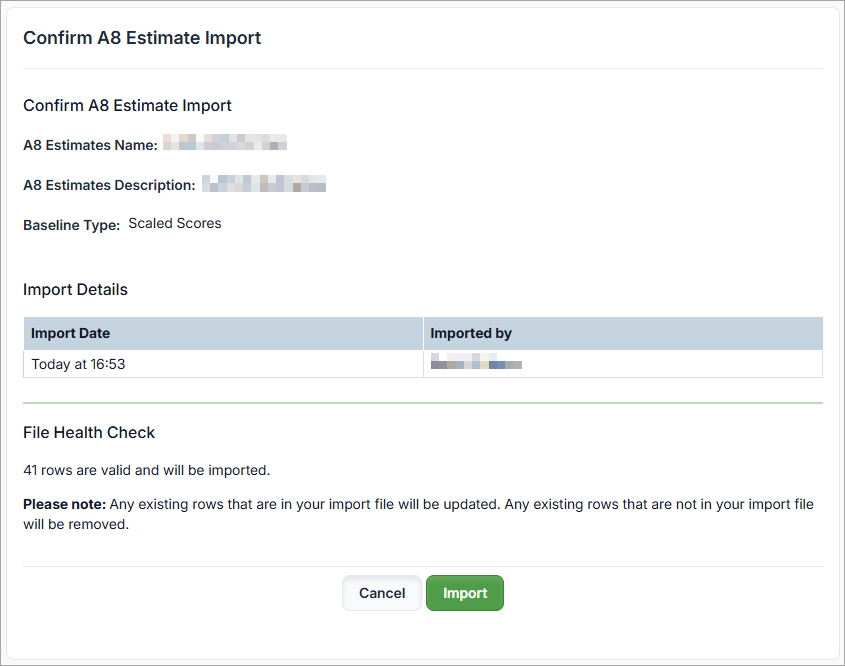 See the File Health Check Issues section below for more information. - Select Import. Analytics populates the Custom A8 Estimates from those in your file.