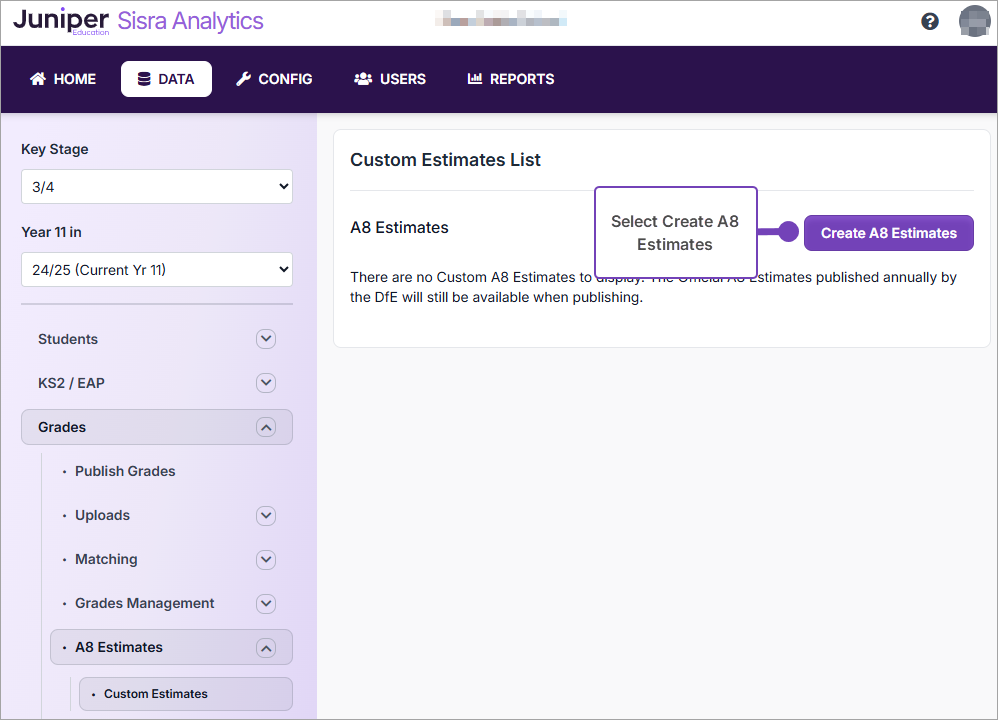 To stop Sisra Analytics from generating Progress 8 scores in KS3/4 reports to avoid staff confusion, leave the A8 Estimates Detail table blank. Step 3 / Publish Grades.