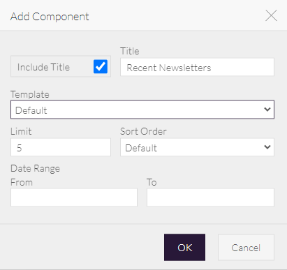 Components are a great way to re-use content you have already added to your site elsewhere. The Newsletter Component will allow you to embed a list of newsletters that you have created using the Digital Newsletter Builder.