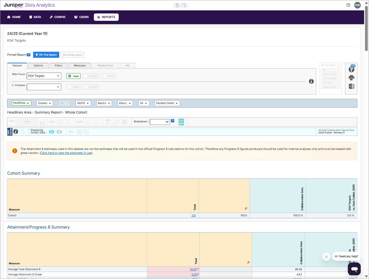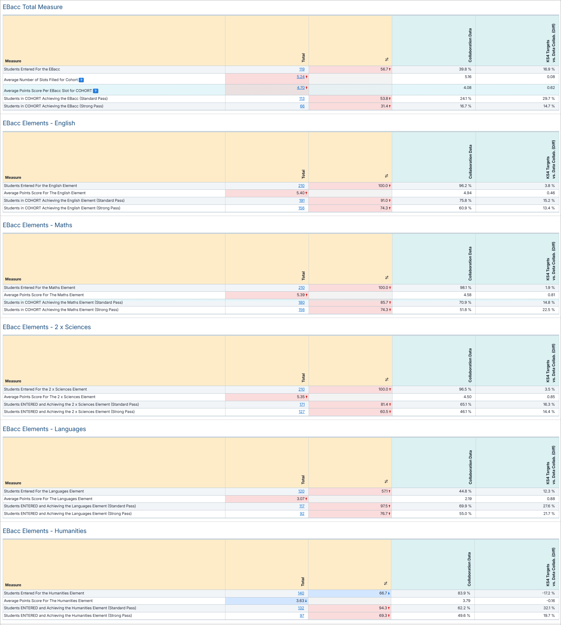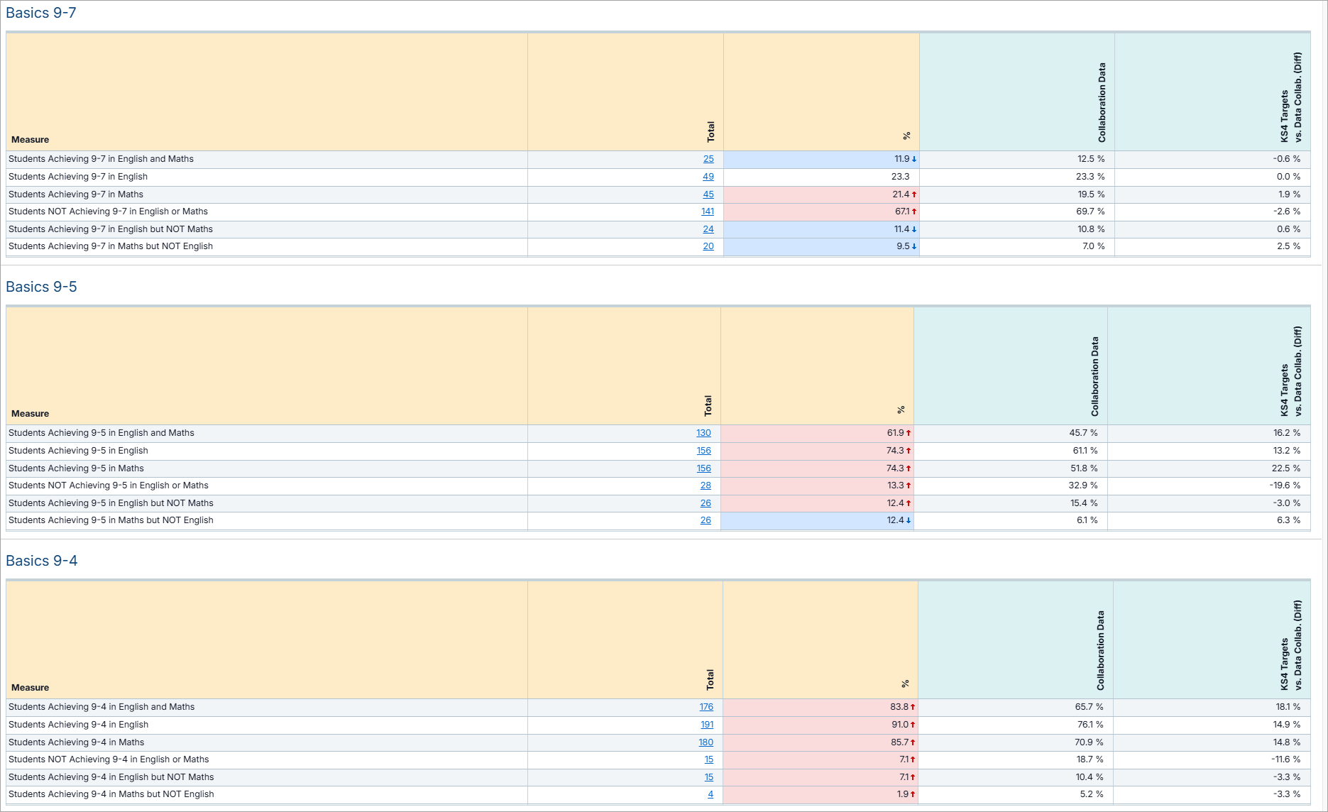 You will then be presented with a series of tables listing your key school performance measures for the cohort, based on the grades in that specific report: