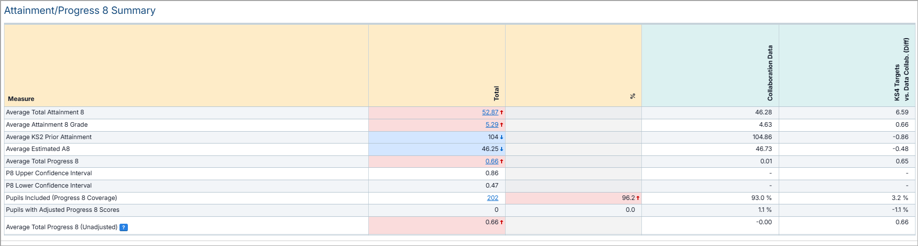 The cohort averages for Attainment 8 and Progress 8 are listed. Take note of the number of students included in Progress 8, as those without valid KS2 data will not be included in Progress 8, but if they are reported on, they will still be included in the cohort figure at the top, and other headline measures.