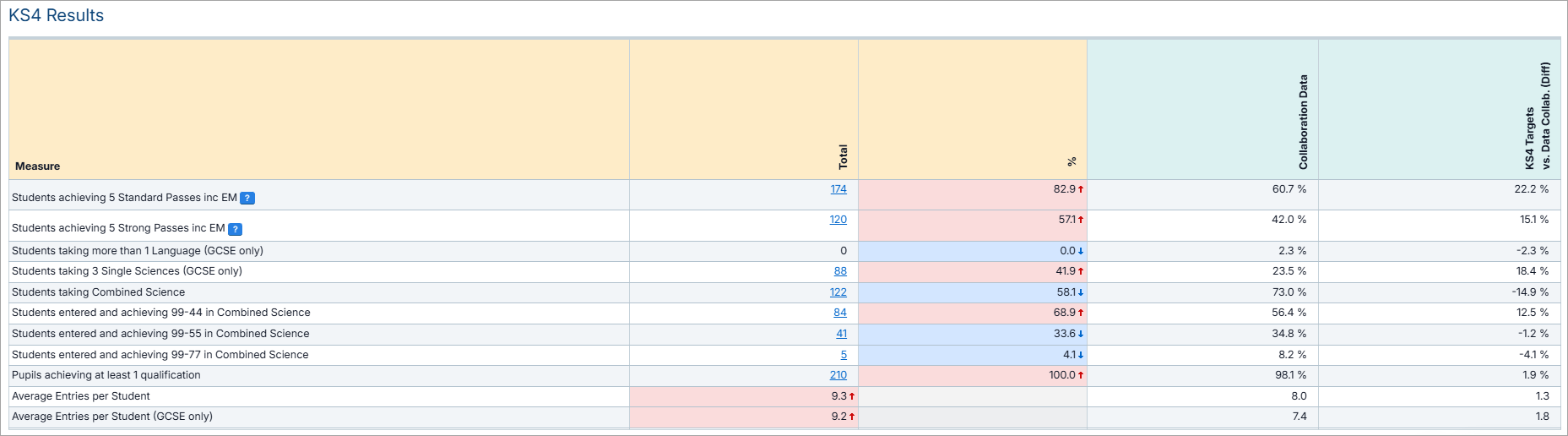 The KS4 Results section contains additional measures that can be compared to historical figures, for example, the 5 Standard passes measure is comparable with the old 5 A*-C measure, as this includes the grades 9-4 or A*-C.